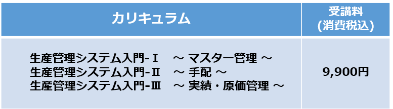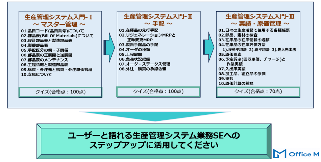 マスター管理、手配、実績・原価管理の3講座に分けて、例を示しながら、体系的、論理的に学習することができます。